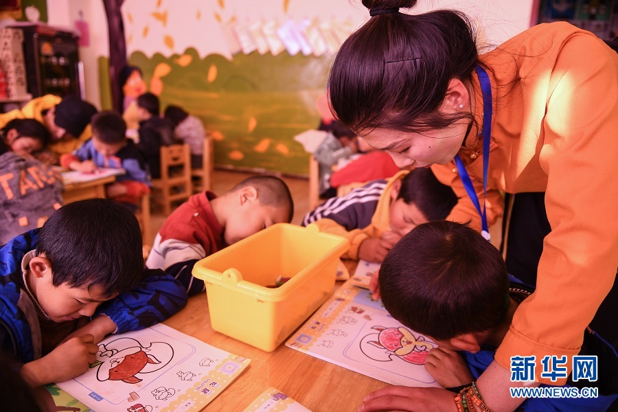 9月17日,青海省果洛藏族自治州瑪沁縣拉加鎮中心幼兒園的老師輔導孩子們上美術課。(新華網潘彬彬 攝)