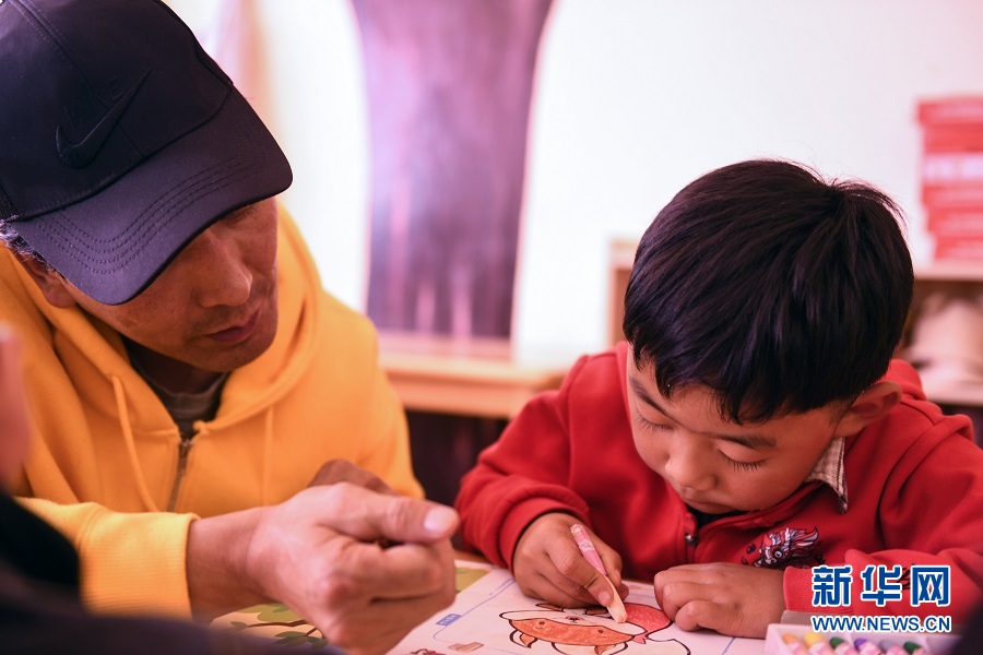 9月17日,青海省果洛藏族自治州瑪沁縣拉加鎮中心幼兒園的老師輔導孩子們上美術課。(新華網潘彬彬 攝)