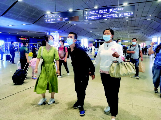 王唯佳(中)到達天津火車站,在輔導員高雨桐(左)和家人陪伴下走向南開大學校車。本報記者白佳麗攝