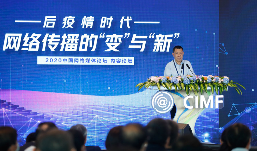 ??? 9月27日,2020中國網(wǎng)絡(luò)媒體論壇內(nèi)容論壇在上海舉行,各界嘉賓圍繞“后疫情時代網(wǎng)絡(luò)傳播的‘變’與‘新’”這一主題開展探討和交流。圖為新華社總編室副主任、全媒編輯中心主任汪金福作主題演講。