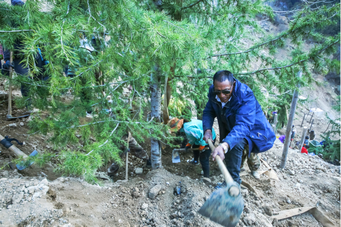 新冠肺炎疫情期間,巴拉格宗景區關閉,斯那定珠投入2000多萬購置了4萬多棵樹苗,帶領200多個員工在景區植樹。 索朗農布/攝