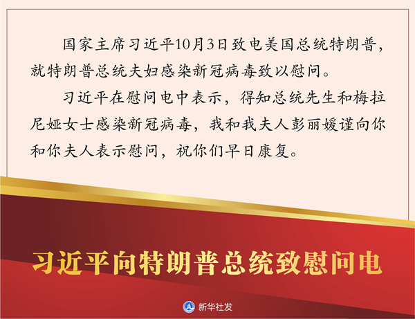習近平在慰問電中表示,得知總統先生和梅拉尼婭女士感染新冠病毒,我和我夫人彭麗媛謹向你和你夫人表示慰問,祝你們早日康復。