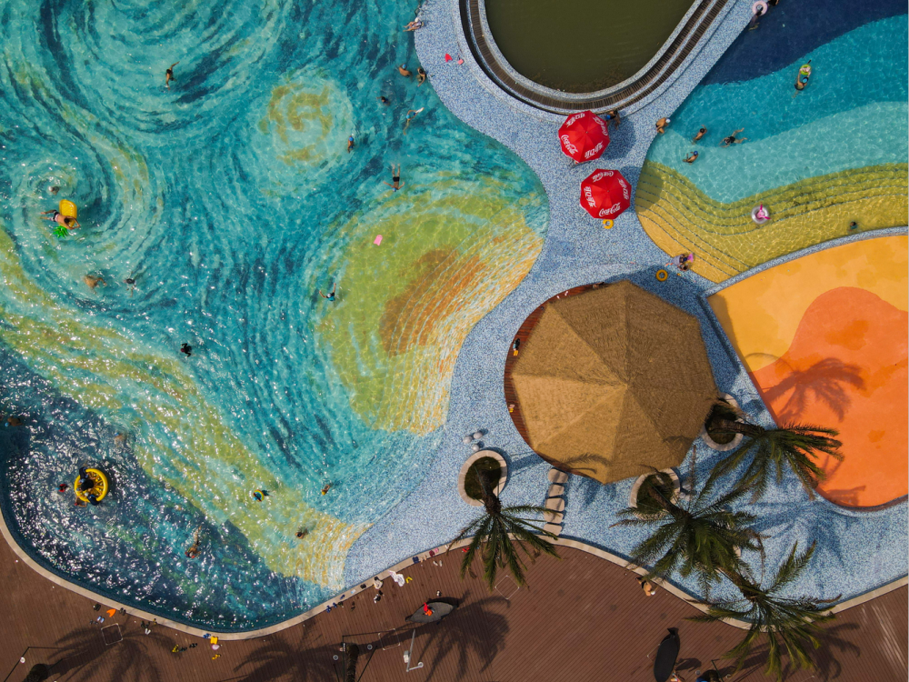 7月19日,成都江灘公園無邊泳池,因為以整幅梵高的星空圖案為底,配上陽光、沙灘、棕櫚樹、草亭等,讓人仿佛置身熱帶海灘