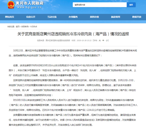 10月22日,黃州區市場監督管理局在排查工作中發現武商量販店黃州店嚴重違反區新冠肺炎疫情防控指揮部第24號通告有關規定,違規銷售兩批未經疾控部門檢測的冷凍冷藏肉類(海產品)。現將有關處理情況通報如下: