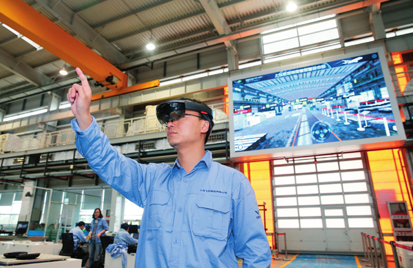 工作人員在中國商飛公司總裝制造中心智慧數控車間使用 AR 眼鏡操控虛擬電子屏幕(2018年5月5日攝)丁汀攝