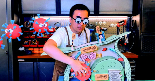 “新型冠狀病毒在細(xì)胞外面游走過程中,總能找到對(duì)應(yīng)的鎖眼,咔嚓,打開細(xì)胞上的鎖,天真的細(xì)胞誤以為營養(yǎng)物質(zhì)來了,于是大門敞開……”在一個(gè)約4分鐘的視頻中,寧原在工作間的長桌上用自己制作的病毒、細(xì)胞等模型,為粉絲趣味介紹新型冠狀病毒是如何入侵人體的。他還邀請(qǐng)武漢大學(xué)醫(yī)學(xué)部病毒學(xué)研究所專家來釋疑病毒變異的相關(guān)問題,那期視頻獲得了500多萬次觀看量。
