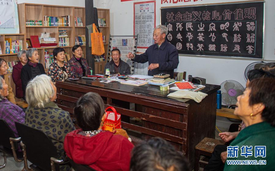 11月17日晚,大陳村村民聚在村圖書(shū)室一同唱歌。大陳村每周在圖書(shū)室組織三次歌唱活動(dòng),歌曲以自編的村歌為主。新華社發(fā)(江漢 攝)