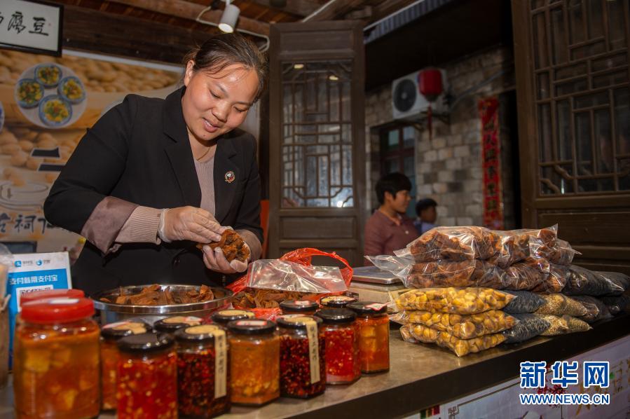 11月17日,大陳村村民汪曉玲在自家經(jīng)營(yíng)的土特產(chǎn)店內(nèi)整理新鮮出爐的地瓜干供游客挑選。新華社發(fā)(江漢 攝)