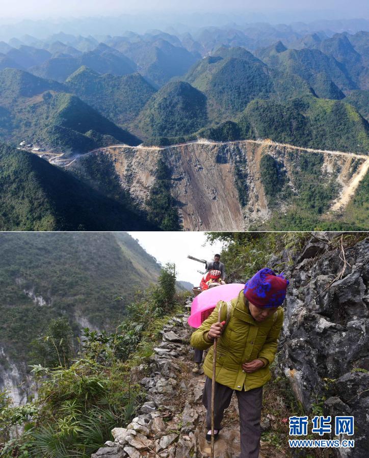 這是一張拼版照片。上圖:已經(jīng)修通水泥路的大化瑤族自治縣板升鄉(xiāng)八好村(2019年11月11日攝,無(wú)人機(jī)照片);下圖:在尚未通路前,八好村村民背著年貨走山路回家(2016年1月26日攝)。新華社記者 黃孝邦 攝