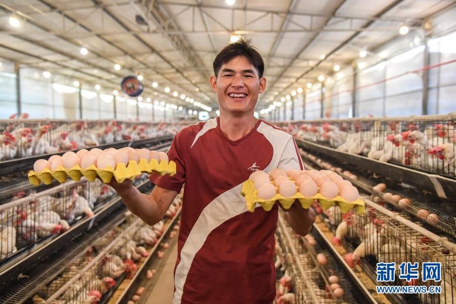 廣西武宣縣金雞鄉(xiāng)仁元村的返鄉(xiāng)創(chuàng)業(yè)者覃永靈在養(yǎng)殖場(chǎng)內(nèi)展示他收獲的雞蛋(6月18日攝)。新華社記者 曹祎銘 攝