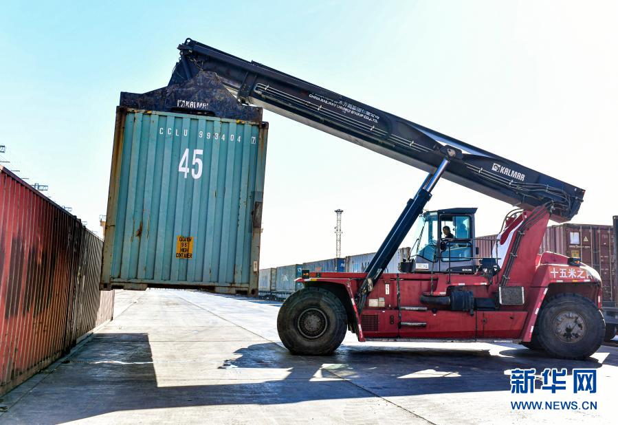 工人在中歐班列烏魯木齊集結中心吊運貨物(3月12日攝)。新華社記者 王菲 攝