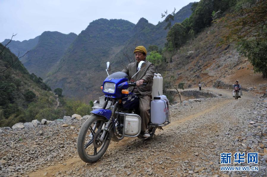 一名取水村民騎行在廣西巴馬瑤族自治縣東山鄉文錢村的山路上(2010年3月7日攝)。新華社記者 周華 攝