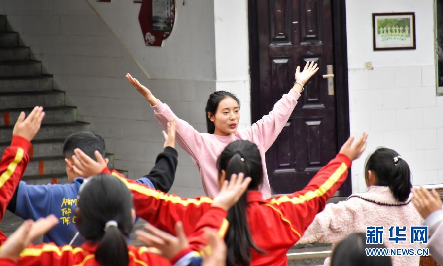 11月18日,在河南省洛陽市嵩縣德亭鎮酒店小學,王予川帶學生做韻律操。新華社記者 韓朝陽 攝