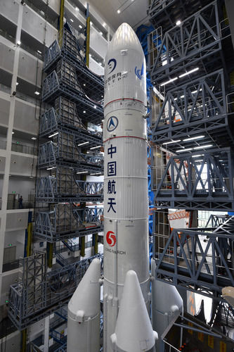 這是11月17日在中國文昌航天發射場拍攝的長征五號遙五運載火箭。新華社記者 郭程 攝