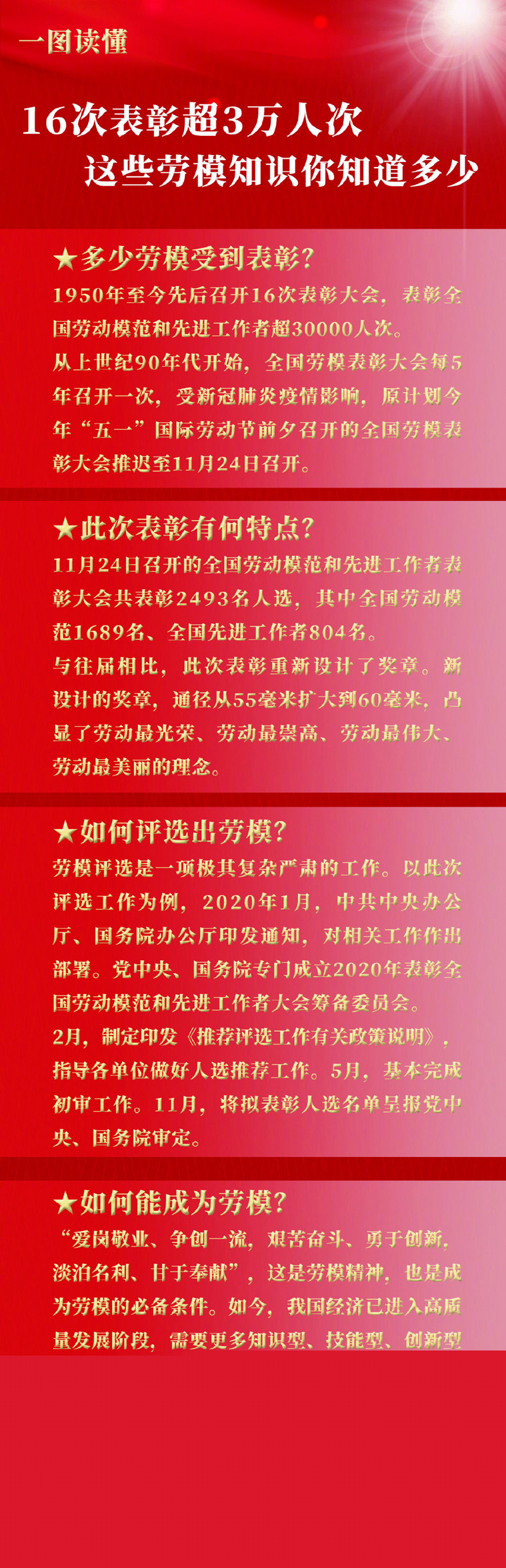 24日,1689名全國勞動模范和804名全國先進工作者在人民大會堂受到表彰,代表全體勞動者接受黨和國家的最高禮贊。新中國成立以來表彰了多少勞模?勞模是怎樣評選出來的?如何才能成為勞模?戳圖了解↓ ?????