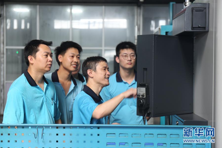 全國勞動模范、寧波中大力德智能傳動股份有限公司設備科科長萬亞勇(右二)在車間指導員工進行數控機床故障診斷(8月17日攝)。新華社發