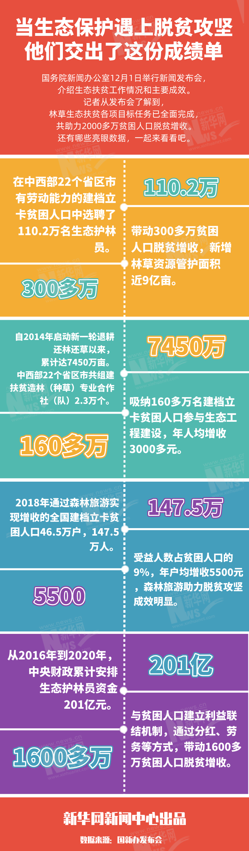 新華網北京12月1日電(汪亞)國務院新聞辦公室于今日舉行新聞發布會,介紹生態扶貧工作情況和主要成效。國家林業和草原局副局長李春良在發布會透露,黨的十八大以來,林草生態扶貧各項目標任務全面完成,在推進生態補償扶貧、推進國土綠化扶貧、推進生態產業扶貧、推進定點幫扶縣脫貧摘帽等四大方面發力,共助力2000多萬貧困人口脫貧增收。
