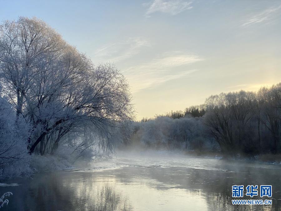 遜克縣位于黑龍江省北部,冬季漫長(zhǎng)而寒冷。當(dāng)?shù)貛?kù)爾濱水電站放水時(shí),水遇冷形成霧氣,落到樹枝上凝結(jié)成霜花,在平臺(tái)村周邊形成綿延的霧凇景觀。
