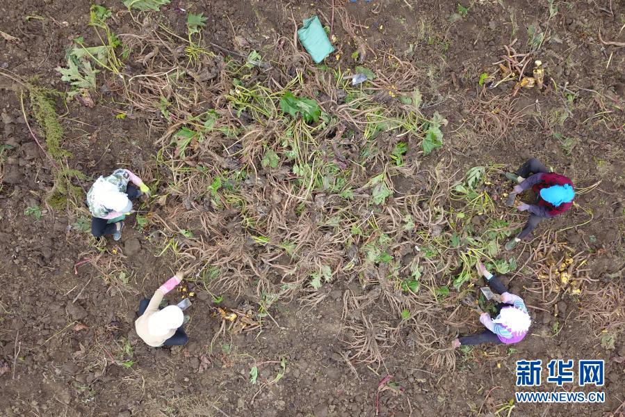 在宕昌縣拉路梁中藥材標(biāo)準(zhǔn)化種植示范基地,村民收獲藥材(9月18日攝,無(wú)人機(jī)照片)。新華社記者 范培珅 攝