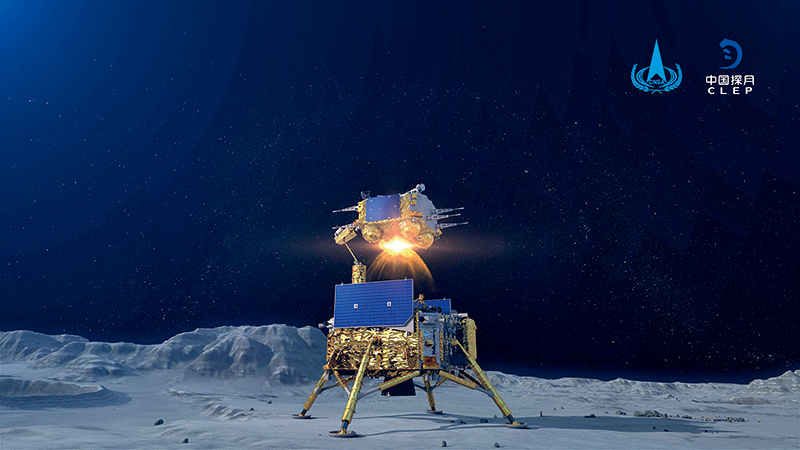 12月3日23時10分,嫦娥五號上升器月面點火,3000 牛發動機工作約6 分鐘后,順利將攜帶月壤的上升器送入到預定環月軌道,成功實現我國首次地外天體起飛。這是嫦娥五號上升器月面點火瞬間模擬 圖國家航天局供圖