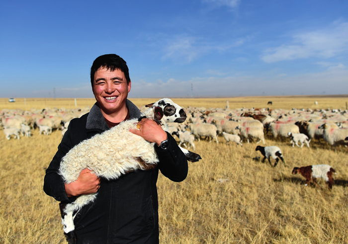 青海省剛察縣泉吉鄉寧夏村牧民達日杰懷抱一只小羊羔(11月12日攝) 張宏祥攝/本刊