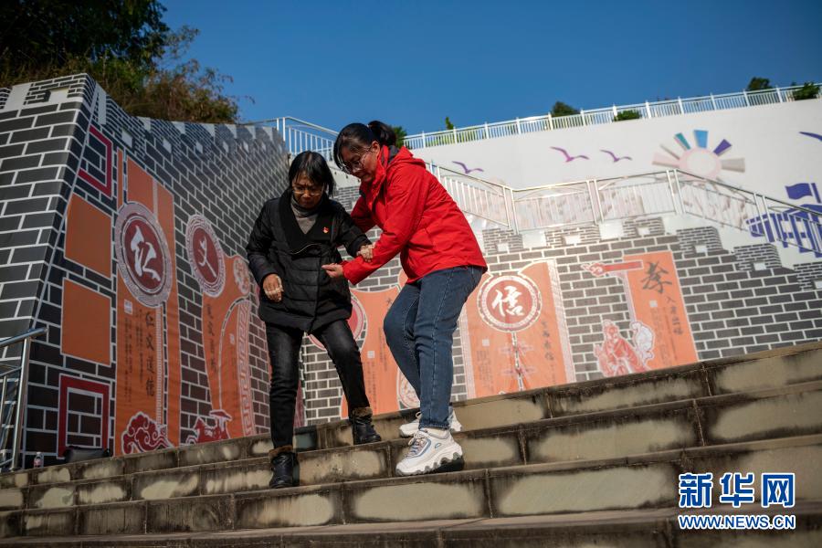 一名老師攙扶張桂梅(左)下臺階(11月30日攝)。新華社發(陳欣波 攝)