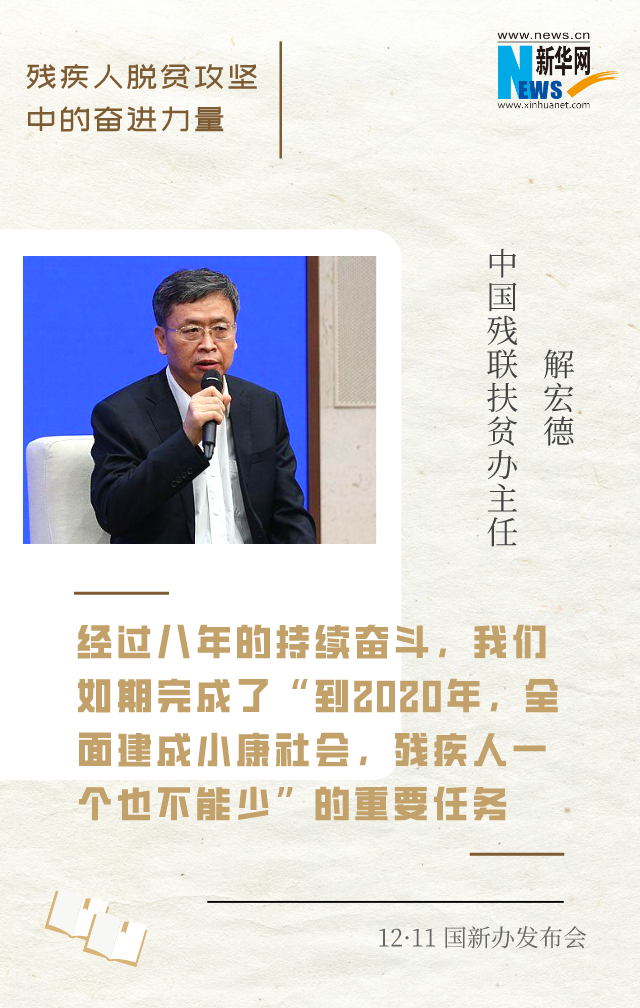 解宏德是中國殘聯扶貧辦主任。五年來,全程參與了殘疾人脫貧攻堅工作。他介紹,在殘疾人脫貧攻堅這條戰線上,各級殘聯組織將殘疾人脫貧攻堅作為最重要、最緊迫、最艱巨的一項政治任務來抓。經過八年的持續奮斗,我國將如期完成“到2020年,全面建成小康社會,殘疾人一個也不能少”的重要任務,現行標準下農村貧困殘疾人將如期全部脫貧,消除殘疾人絕對貧困。