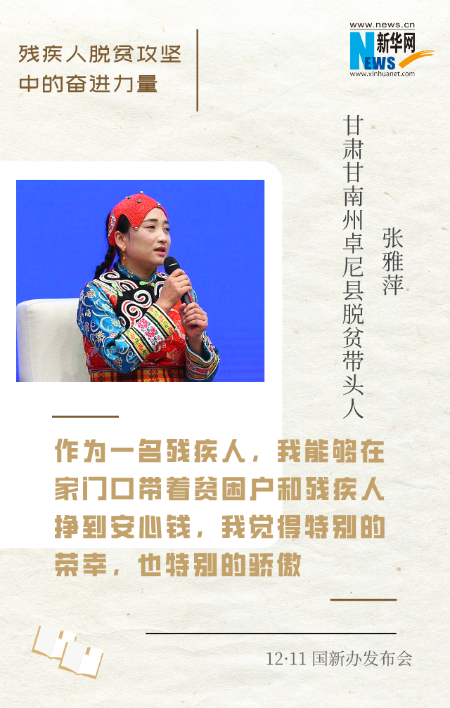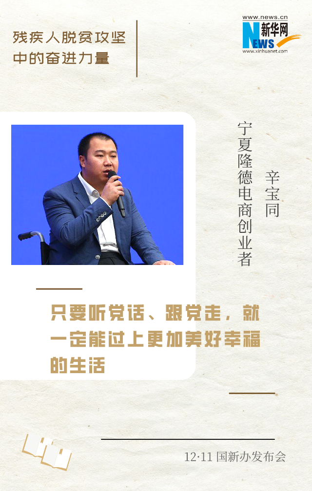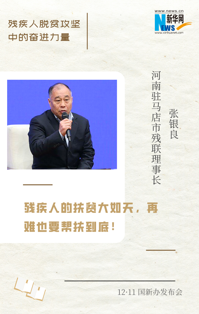 新華網北京12月11日電(王瑩)在脫貧攻堅的戰場上,涌現出許多殘疾人自強脫貧的先進典型和脫貧攻堅一線奮力拼搏的工作者。12月11日上午,國新辦邀請到他們中的4位代表,圍繞“殘疾人脫貧攻堅中的奮進力量”與中外記者見面交流。一起來聽他們的脫貧故事和脫貧經驗。