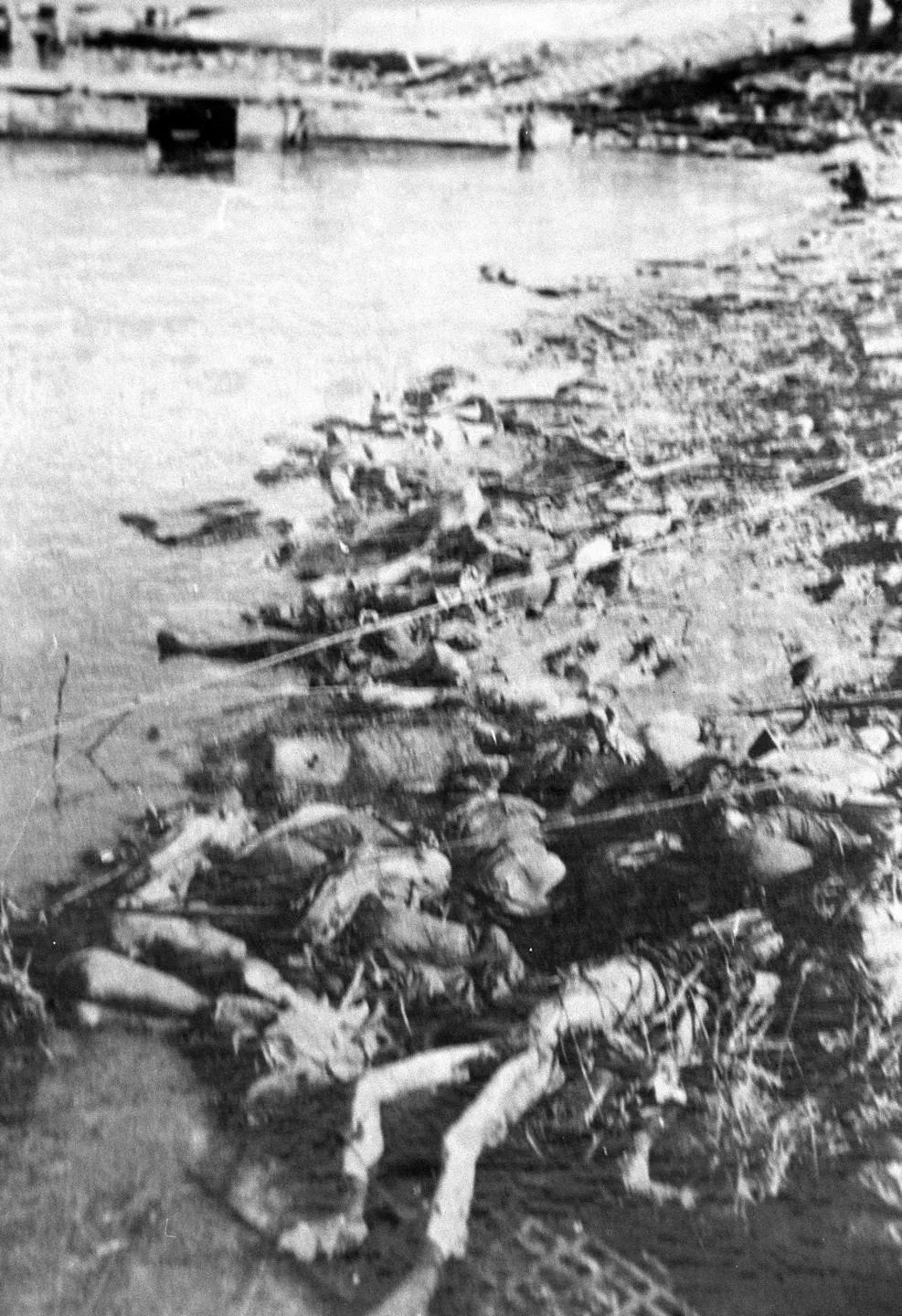 ↑日軍將被殺害的南京市民投入長(zhǎng)江。新華社發(fā)