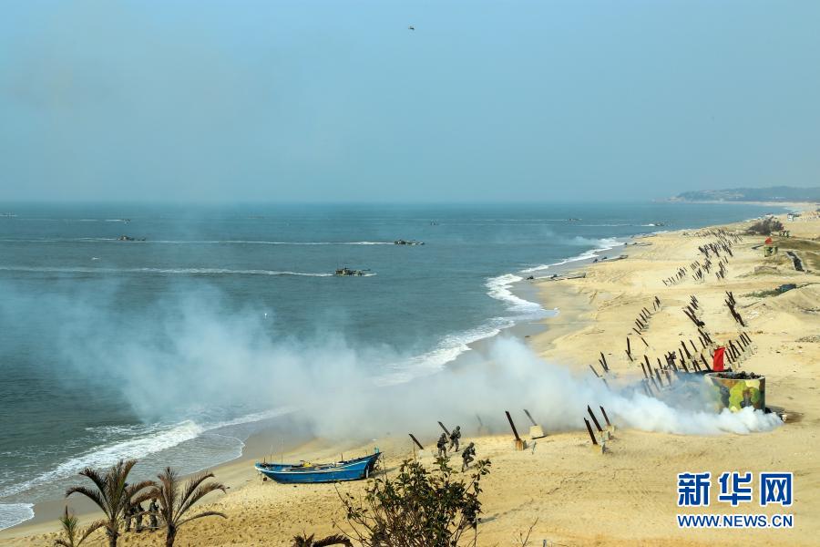 陸軍第72集團軍某旅組織陸空一體實兵演練,藍軍投放煙霧彈干擾紅軍登陸(2017年8月20日攝)。新華社發(莊林毅 攝)