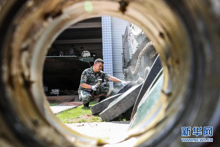 陸軍第72集團軍某旅四級軍士長譚斌在車場維護保養裝備(2019年9月20日攝)。新華社發(王勝強 攝)