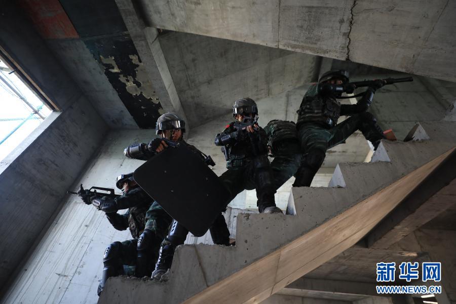 武警新疆總隊(duì)某機(jī)動支隊(duì)特戰(zhàn)一中隊(duì)開展模擬街區(qū)捕殲演練(9月20日攝)。新華社發(fā) (張文 攝)