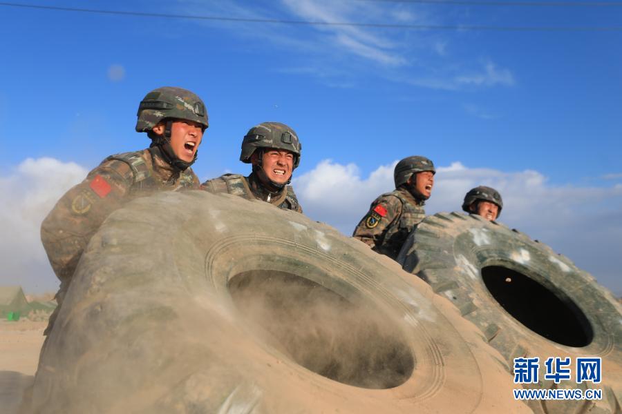 武警新疆總隊(duì)某機(jī)動支隊(duì)特戰(zhàn)一中隊(duì)組織官兵進(jìn)行翻輪胎體能訓(xùn)練(10月30日攝)。新華社發(fā)(張文 攝)