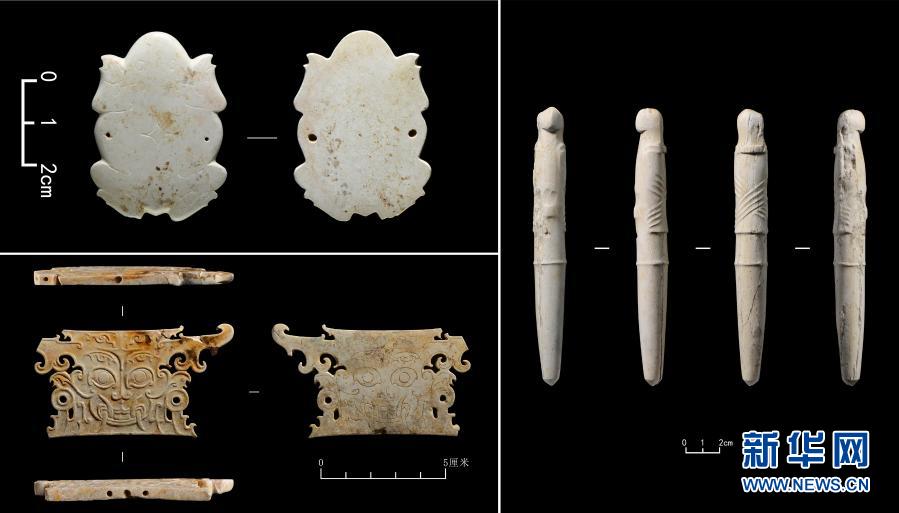 湖南澧縣孫家崗遺址出土的玉飾(拼版照片)。新華社發(國家文物局供圖)