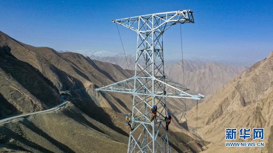 2020年4月28日,在新疆葉城縣南部山區(qū)海拔3100多米的阿卡孜達(dá)坂上,工人登上鐵塔檢修零部件,為放線(xiàn)做準(zhǔn)備(無(wú)人機(jī)照片)。