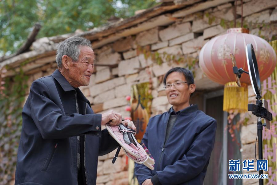 2020年10月28日,河北省沙河市柴關(guān)鄉(xiāng)大康村老支書(shū)李三平(左)在直播中推介村民手工制作的布鞋。今年年初,李三平在兒子李慶斌直播推介農(nóng)產(chǎn)品的過(guò)程中,應(yīng)網(wǎng)友的要求加入直播,收獲了眾多網(wǎng)友點(diǎn)贊。在他的努力下,大康村的小米、蜂蜜等貨品銷(xiāo)路越來(lái)越廣,慕名前來(lái)的游客也更多了。