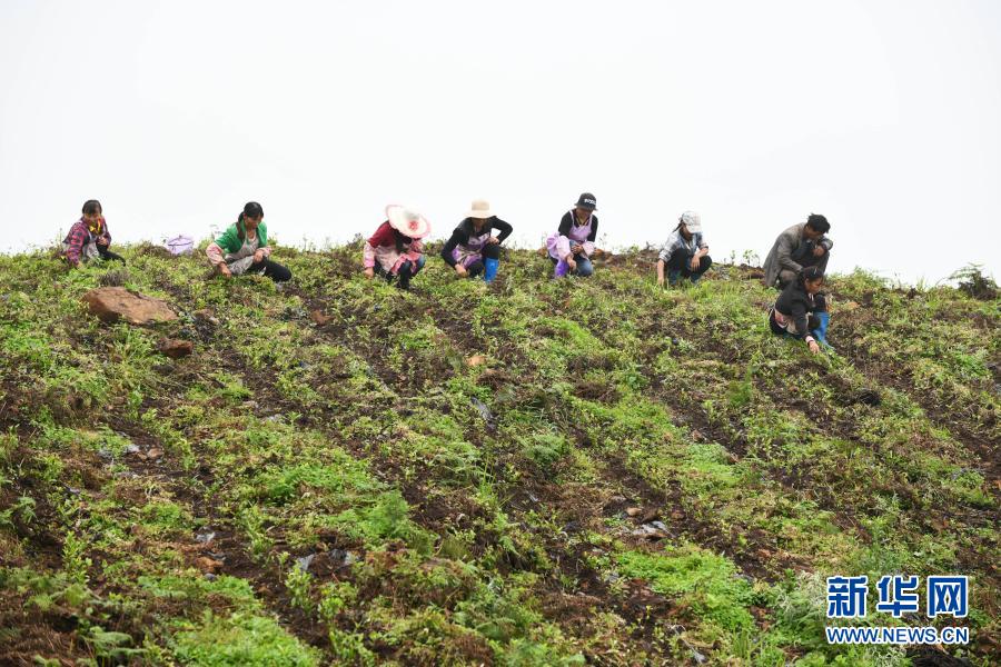 農民在貴州省普安縣地瓜鎮屯上村的“扶貧茶園”里給茶苗除草(2019年7月7日攝)。當地的茶園栽種有浙江安吉黃杜村捐贈的白茶苗。新華社記者 楊文斌 攝