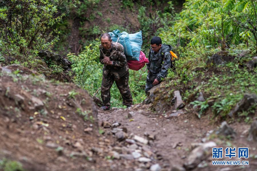 在云南省迪慶藏族自治州香格里拉滇金絲猴國(guó)家公園,護(hù)猴員余小德(左)背著喂滇金絲猴的食物上山(2020年5月23日攝)。新華社記者 胡超 攝