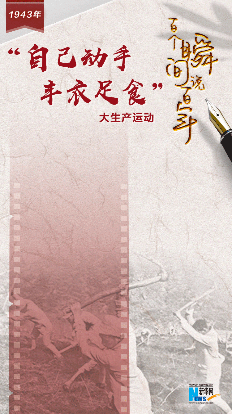 1939年2月,當(dāng)困難剛剛露頭的時(shí)候,毛澤東就發(fā)出了“自己動(dòng)手”的號(hào)召。1941年,黨中央再次強(qiáng)調(diào)必須走生產(chǎn)自救的道路。同年春,八路軍第三五九旅開(kāi)進(jìn)南泥灣實(shí)行軍墾屯田。戰(zhàn)士們用歌聲喚醒沉睡的土地,用汗水澆出萬(wàn)頃良田,使昔日荒涼的南泥灣變成了“糧食堆滿倉(cāng),麥田翻金浪,豬牛羊肥壯”的“陜北的好江南”。到1944年,第三五九旅除吃用全部自給外,達(dá)到了“耕一余一”(即耕種一年莊稼,除消耗外,可剩余一年吃的糧食),成為全軍大生產(chǎn)運(yùn)動(dòng)的模范。一曲動(dòng)人的《南泥灣》流傳至今,久唱不衰。