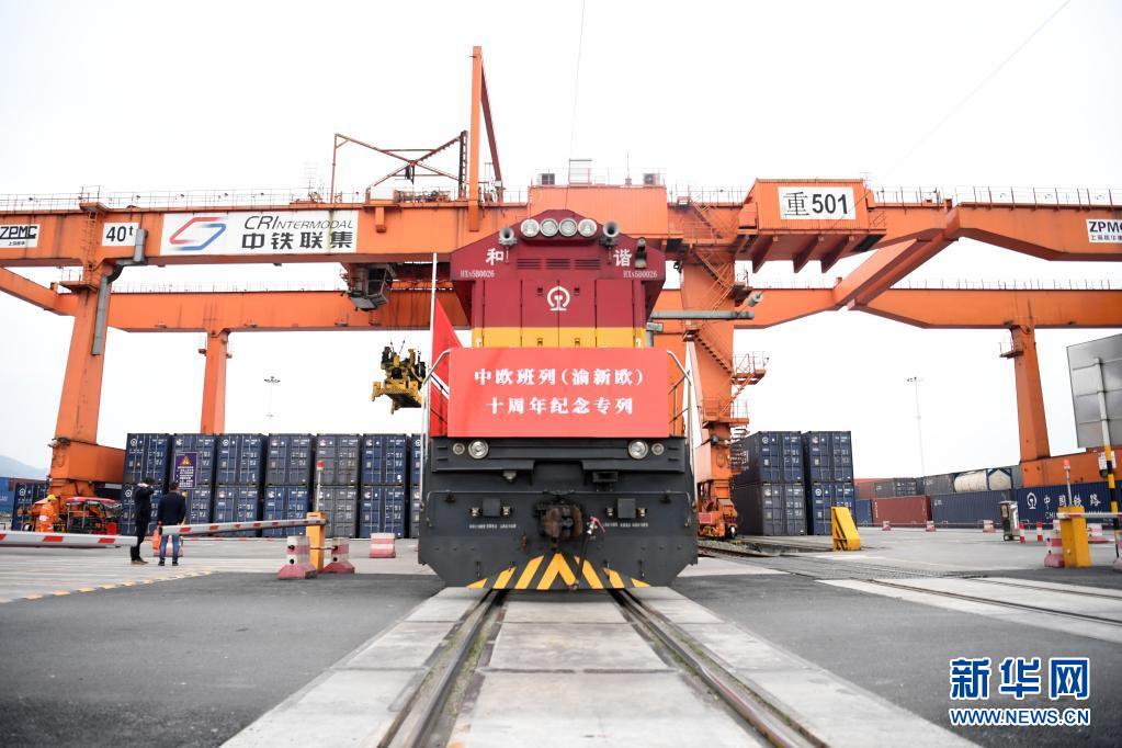 中歐班列(渝新歐)十周年紀(jì)念專(zhuān)列在重慶團(tuán)結(jié)村站等待發(fā)車(chē)(3月19日攝)。新華社記者 唐奕 攝