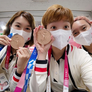 杜凱琹(中)和隊友們與奧運獎牌合影。受訪者供圖