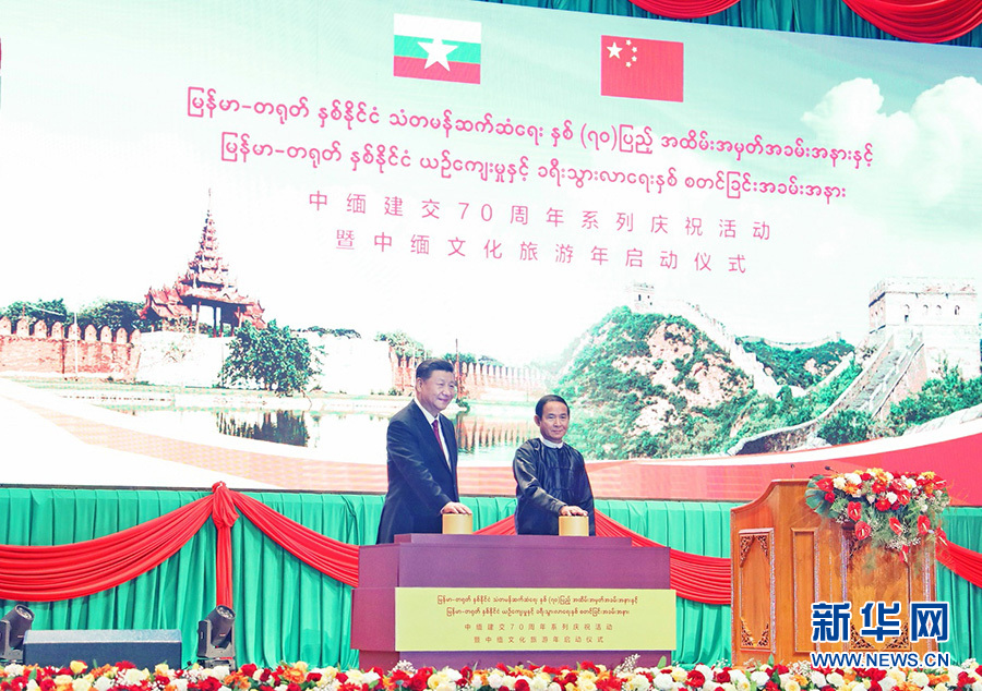 當地時間1月17日晚,國家主席習近平在內比都第二國際會議中心出席中緬建交70周年慶?;顒郁咧芯捨幕糜文陠觾x式。這是習近平和緬甸總統溫敏共同按下按鈕,正式啟動中緬文化旅游年。 新華社記者 黃敬文 攝
