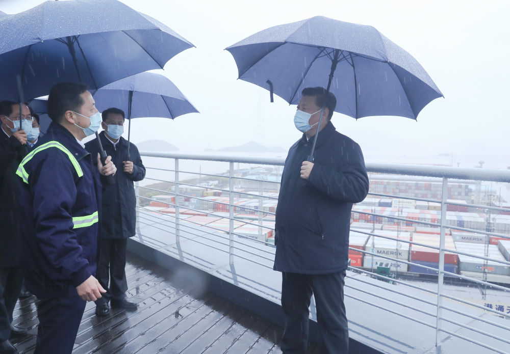 從新華社發(fā)出的現(xiàn)場(chǎng)照片看,總書記在寧波舟山港穿山港區(qū)碼頭上沒有佩戴口罩?!?