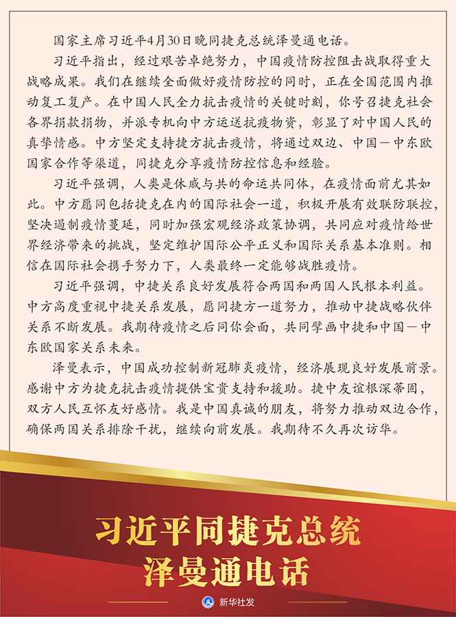 習近平強調,人類是休戚與共的命運共同體,在疫情面前尤其如此。中方愿同包括捷克在內的國際社會一道,積極開展有效聯(lián)防聯(lián)控,堅決遏制疫情蔓延,同時加強宏觀經濟政策協(xié)調,共同應對疫情給世界經濟帶來的挑戰(zhàn),堅定維護國際公平正義和國際關系基本準則。相信在國際社會攜手努力下,人類最終一定能夠戰(zhàn)勝疫情。