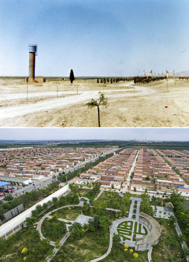 拼版照片:上圖為寧夏永寧縣閩寧鎮(zhèn)建設(shè)初期的鄉(xiāng)鎮(zhèn)雛形(資料照片);下圖為俯瞰寧夏永寧縣閩寧鎮(zhèn)原隆移民村(2016年7月22日攝,新華社記者 王鵬攝)