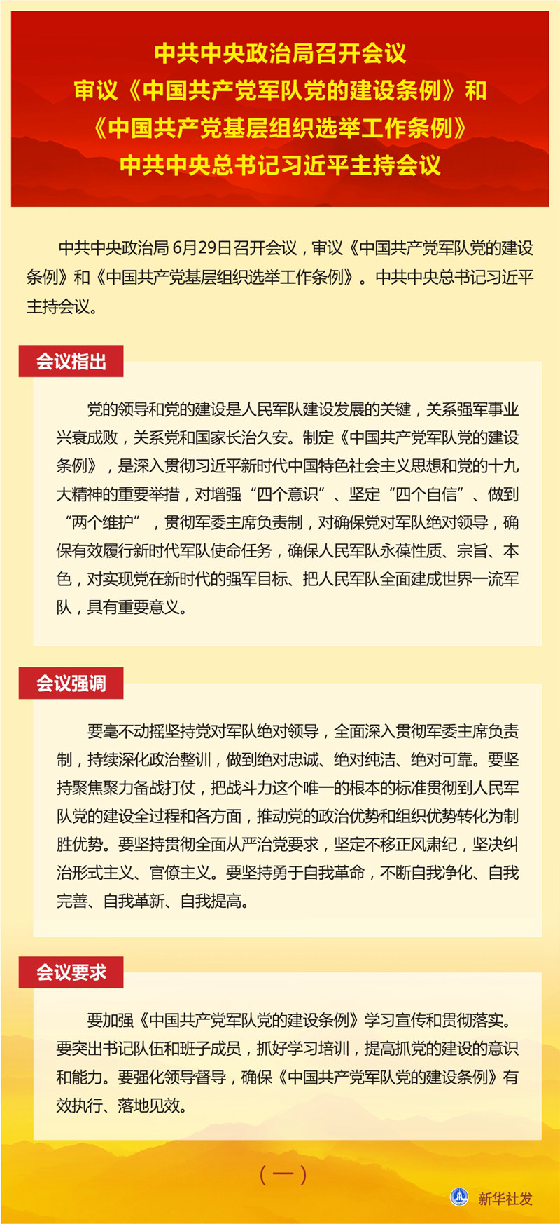 新華社北京6月29日電? 中共中央政治局6月29日召開會(huì)議,審議《中國共產(chǎn)黨軍隊(duì)黨的建設(shè)條例》和《中國共產(chǎn)黨基層組織選舉工作條例》。中共中央總書記習(xí)近平主持會(huì)議。