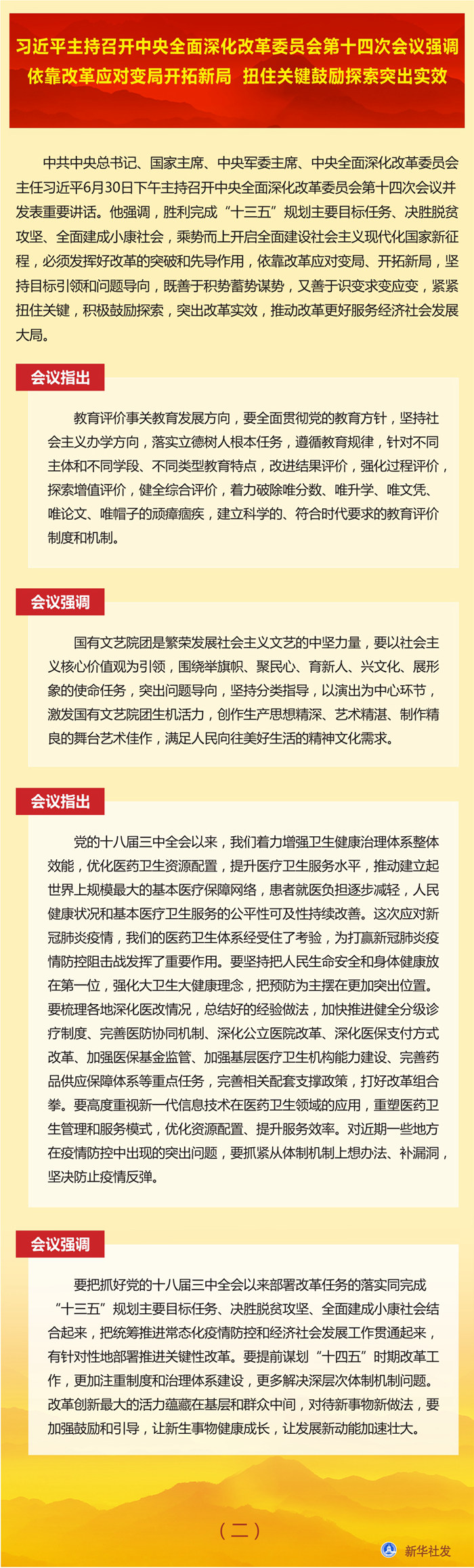 新華社北京6月30日電? 中共中央總書記、國家主席、中央軍委主席、中央全面深化改革委員會主任習(xí)近平6月30日下午主持召開中央全面深化改革委員會第十四次會議并發(fā)表重要講話。他強調(diào),勝利完成“十三五”規(guī)劃主要目標(biāo)任務(wù)、決勝脫貧攻堅、全面建成小康社會,乘勢而上開啟全面建設(shè)社會主義現(xiàn)代化國家新征程,必須發(fā)揮好改革的突破和先導(dǎo)作用,依靠改革應(yīng)對變局、開拓新局,堅持目標(biāo)引領(lǐng)和問題導(dǎo)向,既善于積勢蓄勢謀勢,又善于識變求變應(yīng)變,緊緊扭住關(guān)鍵,積極鼓勵探索,突出改革實效,推動改革更好服務(wù)經(jīng)濟社會發(fā)展大局。