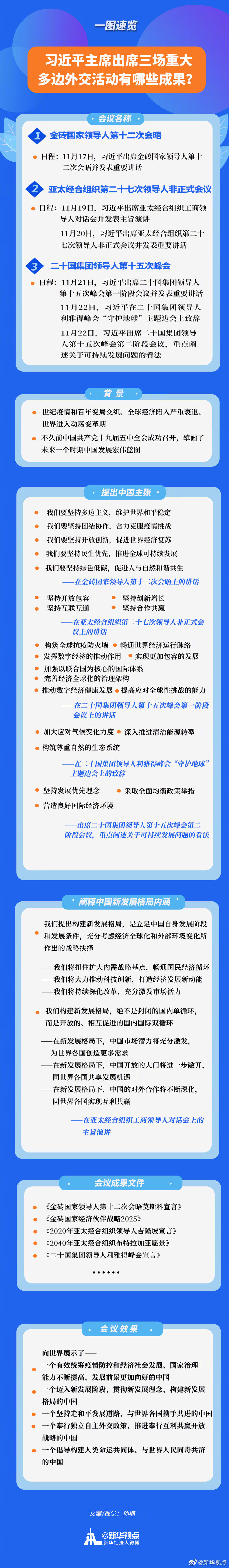 11月17日至22日,國家主席習近平接連出席金磚國家領導人第十二次會晤、亞太經合組織第二十七次領導人非正式會議、二十國集團領導人第十五次峰會三場重大多邊外交活動,并發表一系列重要講話。習主席的講話有哪些要點?提出了哪些中國主張?是如何闡釋中國新發展格局內涵的?戳圖速覽↓
