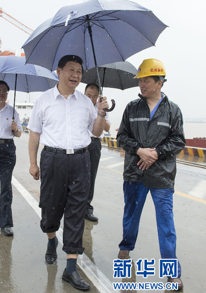 2013年7月21日至23日,中共中央總書記、國家主席、中央軍委主席習(xí)近平在湖北調(diào)研全面深化改革問題和當(dāng)前經(jīng)濟(jì)運行情況。 21日上午,習(xí)近平冒雨來到武漢新港陽邏集裝箱港區(qū)考察。 新華社記者 李學(xué)仁 攝