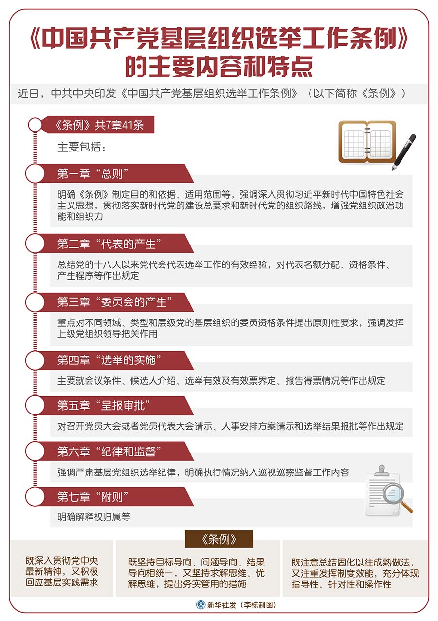 答:《條例》共7章41條,主要包括:第一章“總則”,明確《條例》制定目的和依據(jù)、適用范圍等,強(qiáng)調(diào)深入貫徹習(xí)近平新時(shí)代中國(guó)特色社會(huì)主義思想,貫徹落實(shí)新時(shí)代黨的建設(shè)總要求和新時(shí)代黨的組織路線,增強(qiáng)黨組織政治功能和組織力。第二章“代表的產(chǎn)生”,總結(jié)黨的十八大以來(lái)黨代會(huì)代表選舉工作的有效經(jīng)驗(yàn),對(duì)代表名額分配、資格條件、產(chǎn)生程序等作出規(guī)定。第三章“委員會(huì)的產(chǎn)生”,重點(diǎn)對(duì)不同領(lǐng)域、類型和層級(jí)黨的基層組織的委員資格條件提出原則性要求,強(qiáng)調(diào)發(fā)揮上級(jí)黨組織領(lǐng)導(dǎo)把關(guān)作用。第四章“選舉的實(shí)施”,主要就會(huì)議條件、候選人介紹、選舉有效及有效票界定、報(bào)告得票情況等作出規(guī)定。第五章“呈報(bào)審批”,對(duì)召開(kāi)黨員大會(huì)或者黨員代表大會(huì)請(qǐng)示、人事安排方案請(qǐng)示和選舉結(jié)果報(bào)批等作出規(guī)定。第六章“紀(jì)律和監(jiān)督”,強(qiáng)調(diào)嚴(yán)肅基層黨組織選舉紀(jì)律,明確執(zhí)行情況納入巡視巡察監(jiān)督工作內(nèi)容。第七章“附則”,明確解釋權(quán)歸屬等。